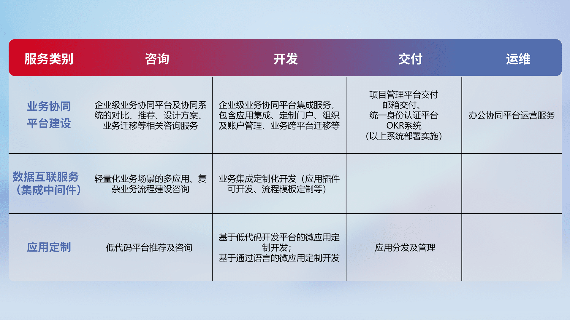 针对钉钉、、、、企微、、、IDaas等平台级产品提供产品的规划、、、方案、、交付、、定制化开发等服务,,,实现如统一协同办公、、、智能客户服务、、混合会议管理、、、、智能数据查询、、、等业务场景,,实现数字化转型。。。