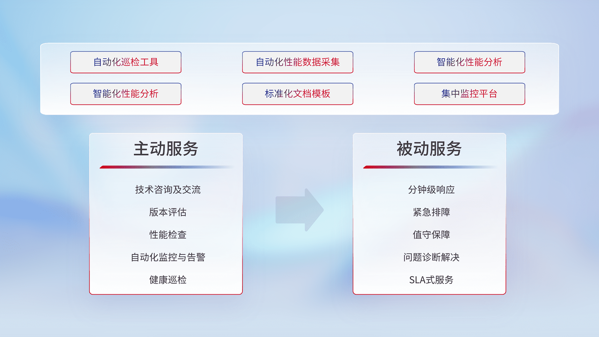 智能化工具和标准化文档,,,,保障服务质量,,,提供主动服务(包含技术咨询、、、、版本评估、、、性能检查、、自动化监控与告警、、、、健康巡检)和被动服务包含(分钟级响应、、紧急排障、、值守保障、、、问题诊断解决、、、、SLA服务)。。。。